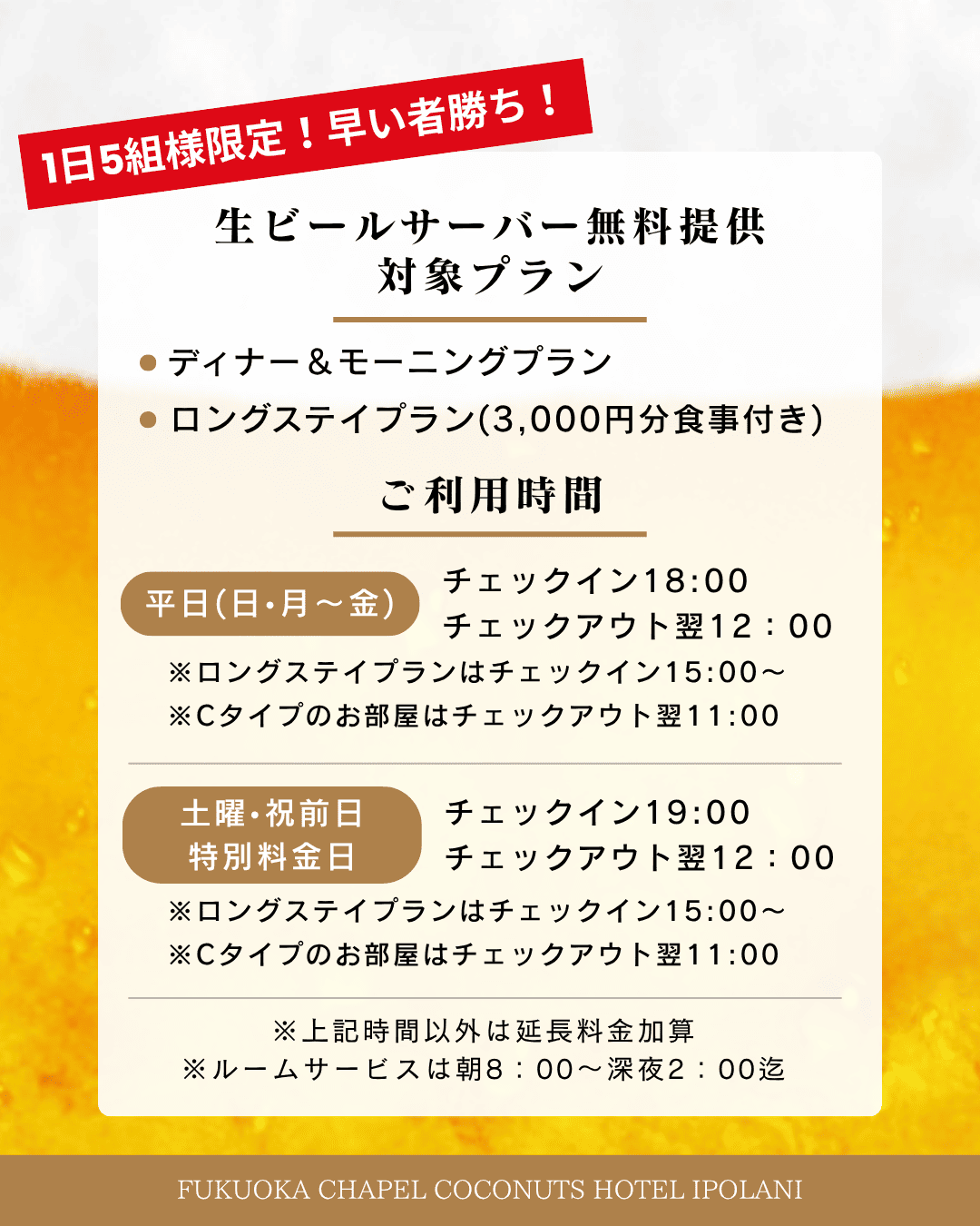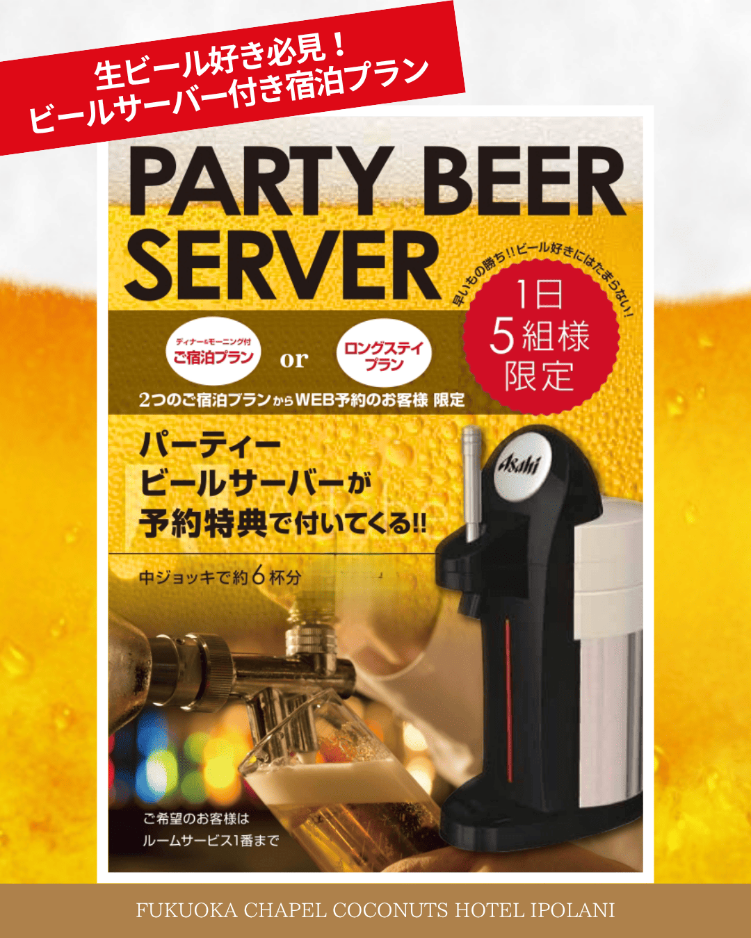 【ビール好き必見!】対象の宿泊プランをご予約いただくと、予約特典として生ビールサーバーを無料提供いたします!