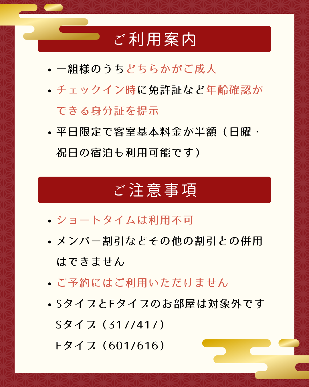 なんと、お部屋料金を通常の半額でご案内させて頂きます♪♪♪