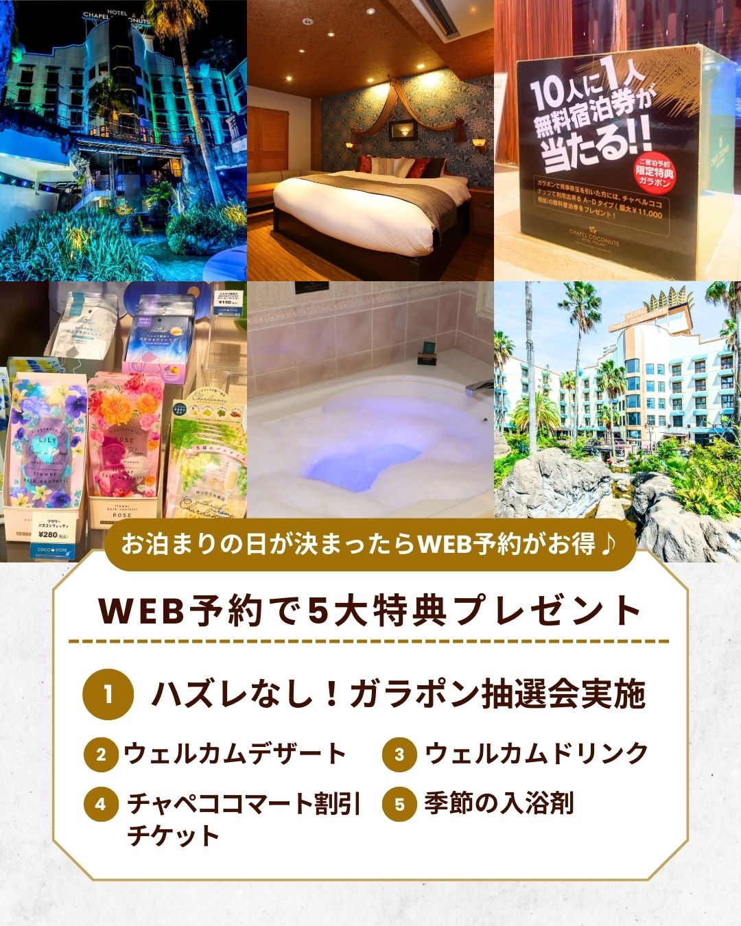 チャペルココナッツ福岡ではご宿泊予約でご来店いただいたお客様限定でガラポン特典をご用意しております。
